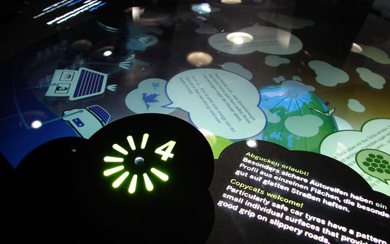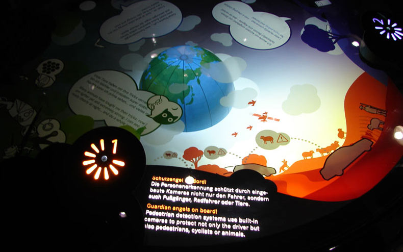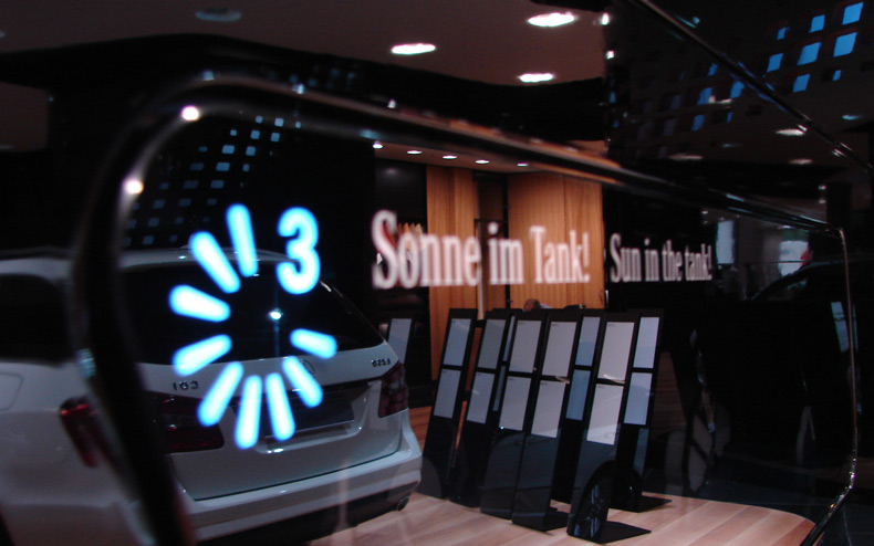 In den neu konzipierten Mercedes-Benz Showroom wurde eine Kinderspur integriert, die auf sensible und kritische Weise an die Themen »Sicher Fahren«, »Umweltbewusster Verkehr« und »Bionic« heranführt. Über verschiedene, interaktive Stationen können, mit Hilfe einer Taschenlampe, die einzelnen Themen spielerisch entdeckt werden. So simuliert man einen Autoscheinwerfer, entdeckt im »animierten Wald« verschiedene Tiere – von denen die Ingenieure gelernt haben – oder lädt mit dem Licht eine Batterie für elektrisches Fahren. Bei allen Installationen verschwinden die Grenzen zwischen der haptischen und der medialen Ebene. Der gemeinsam mit Atelier Markgraph entwickelte Parcours besteht aus mehrschichtigen, theatherhaften Bühnenaufbauten, die durch Sensoren, Monitore und die Taschenlampe zum Leben erweckt werden.